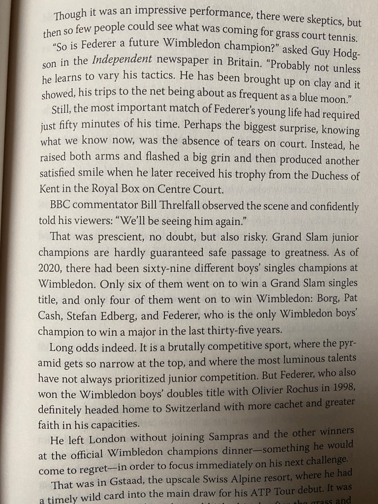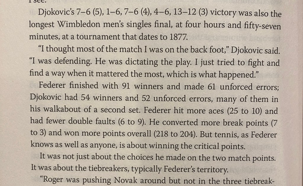 Some of the more interesting chapters were late in the book as Roger put together the Laver Cup, dealt with injuries, and became more involved in his foundation while preparing for a life outside of tennis. Clarey puts together some interesting stats on how many matches Federer blew while having match points. As a fan, I think we only think of the wins rather than those hard loses. For his part, Roger always looks forward – that motivational poster part – he moves on quickly and at one point stresses to Clarey that “things” tend to even out. That net cord winner on game point sometimes goes your way later in the match. It’s probably not a bad way to look at life, all things considered.
